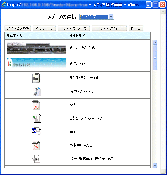 | 「総合メニュー>5.メディア管理」機能からアップロードされたメディアファイルが表示されます。 |